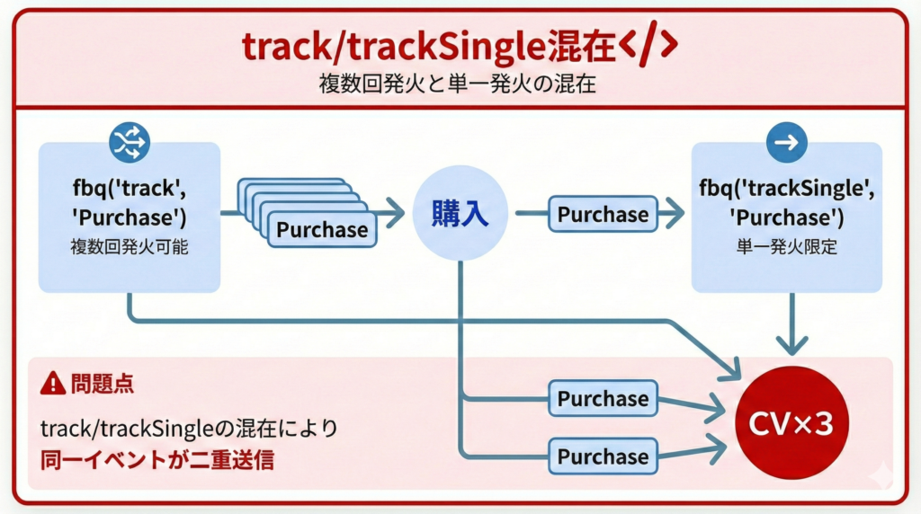 といった環境下では、trackSingle で1回のみ送信しているつもりのCVに対して、別箇所で設定された track が複数回発火するケースが起こり得ます。