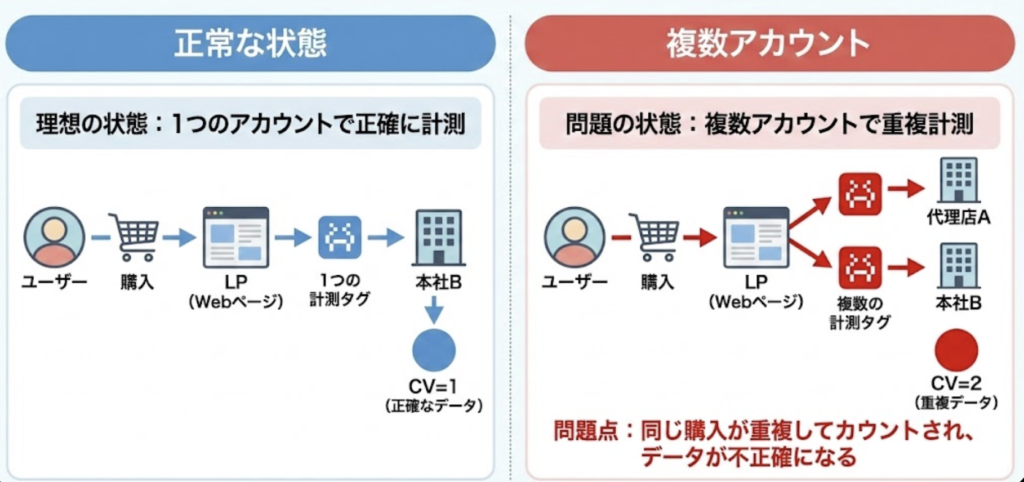 複数の広告アカウントを運用している場合や、代理店・外部担当者が設定を分担しているケースでは、違うピクセルIDが同一LP(サンクスページ等)に設置されてしまうことがあります。この場合、ユーザーのコンバージョン1件に対して、