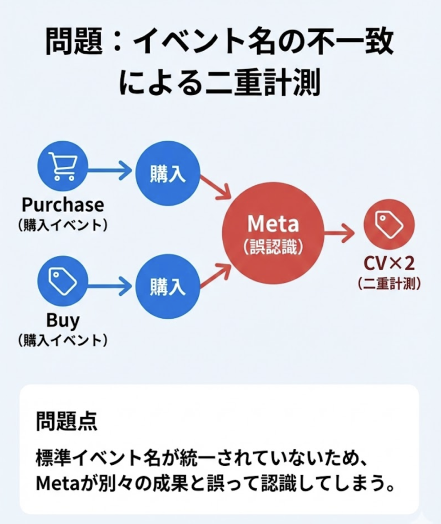 といった具合に、イベント名が統一されていない場合、Metaはそれぞれを別の成果イベントとして認識します。