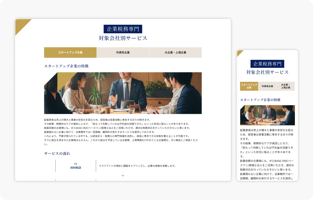 上場企業や外資系企業の税務支援を強みとする税理士法人として、専門性・実績・対応領域を明確に伝え、信頼感を高めるWebサイトへの刷新を目指した。