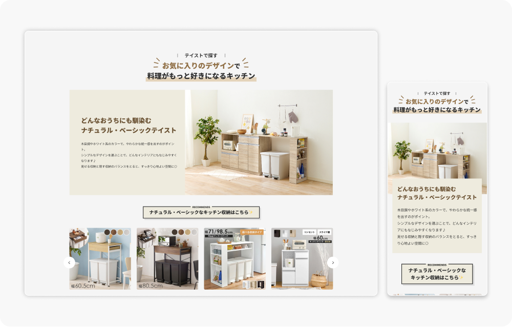 季節トレンドと検索需要をもとに、キッチン収納特集を含む複数の特集ページを企画。カテゴリの切り口、掲載商品の選定基準、ページ内の導線を設計した。